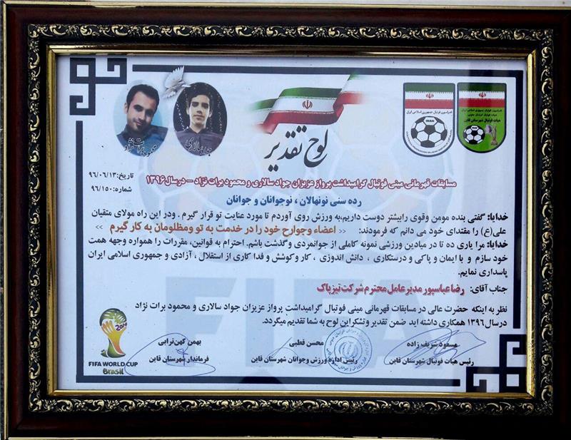 تجلیل ازمدیریت محترم کارخانه در اختتامیه مسابقات مینی فوتبال شهرستان قاین